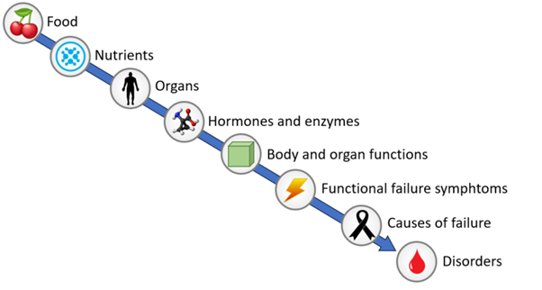 To test my methodology I decided to take a data driven approach while examining the human body. I want to link what we eat to how this can affect the complains we experience when something of our body fails. You cannot directly link eating (or not eating) fruit to a headache but perhaps by linking the right data you can see that there is (or isn't) a relation between fruit and a headache. To do this I came up with a few different logical groups that contain all relevant information to find these relationships. The different tree groups look like this: