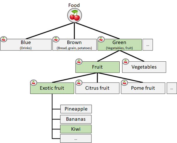 As you can see, it only takes 4 steps to find a kiwi. So this tree isn't very deep. You can also divide kiwi to various different types of kiwi but you have to ask yourself how this affects the ultimate goal. At this point I decided not to go down any further as this level of detail should be enough.
