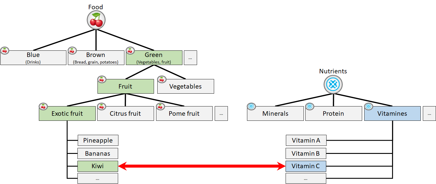As you can see, a kiwi contains vitamin C but no vitamin A. You can also see that a kiwi is an exotic fruit and vitamin C is no protein. If you continue to create these trees you'll eventually end up having a dataset that will tell you eating a kiwi will help you see better in the dark. A kiwi a day will keep the optometrist or eye doctor away! This can be seen in the full tree structure as vitamin C is linked to the ileum which makes retinol which is good by your eyesight and keeps the skin young. If you reverse this process based on this dataset a doctor could ask you if you eat enough fruit when you're complaining about being unable to see properly in the dark. The data will support this and perhaps create links that would otherwise never get noticed. If you would like to see this, the model is setup in Dutch so just get in touch with me and I'll show you.